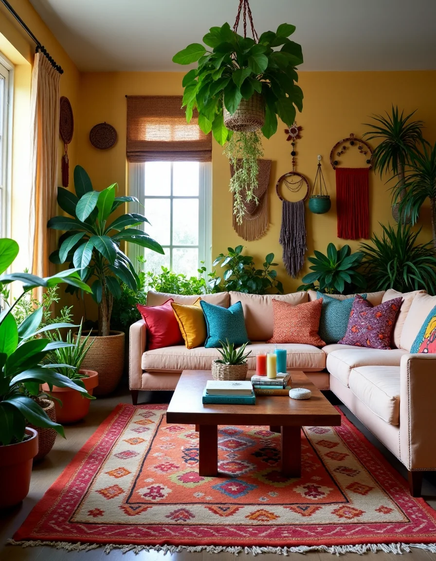 This vibrant bohemian living room bursts with life and personality, featuring an abundance of lush indoor plants placed in various terracotta and woven baskets. A large, geometric-patterned area rug in warm tones of terracotta, saffron, and teal anchors the space beneath a sectional sofa adorned with an assortment of mismatched patterned throw pillows. An eclectic mix of ethnic decor, including colorful wall hangings, intricate dreamcatchers, and vintage textiles showcased on the walls, adds a worldly charm. A rustic wooden coffee table, artfully stacked with coffee table books and vibrant candles, stands at the center, while macramé plant hangers dangle from the ceiling, enveloping the room in a boho atmosphere full of creativity and comfort.